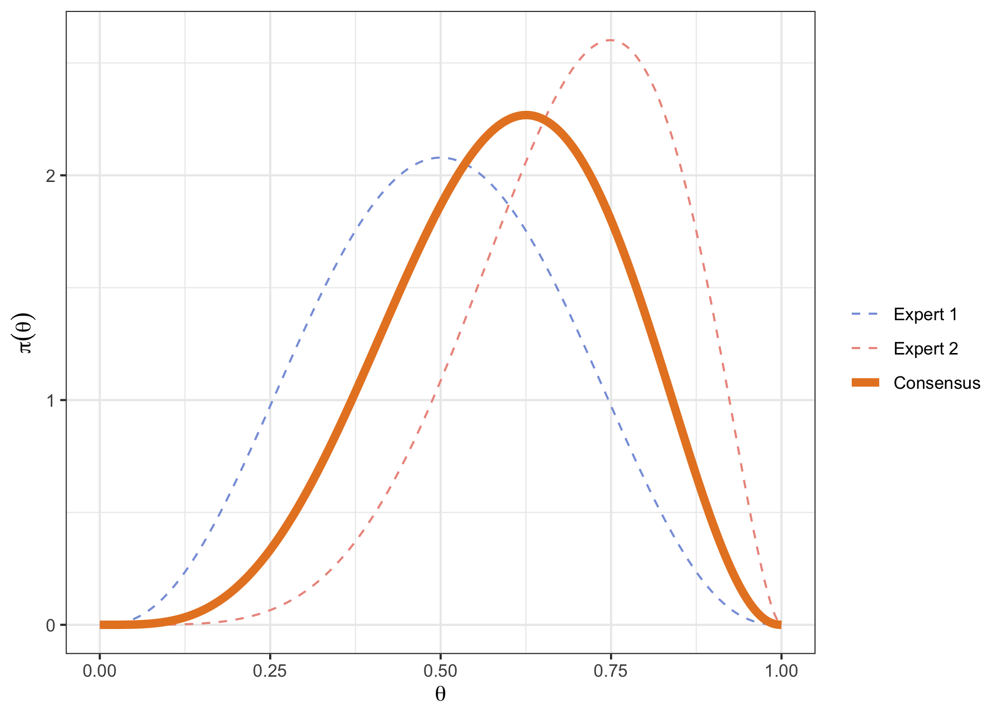 v <- cbind(c(0.2, 0.4, 0.5, 0.6, 0.8), c(0.5, 0.6, 0.7, 0.8, 0.9), c(0.35, 0.5, 0.6, 0.7, 0.85)) p <- c(0.1, 0.25, 0.5, 0.75, 0.9) consensusPrior <- fitdist(vals = v, probs = p, lower = 0, upper = 1, expertnames=c("Expert 1", "Expert 2", "Consensus"))consensusPrior$Beta## shape1 shape2 ## Expert 1 3.634819 3.634835 ## Expert 2 6.047483 2.692690 ## Consensus 4.822237 3.288318consensusPlot <- plotfit(consensusPrior, d = "beta", xl = 0, xu = 1, xlab = expression(theta), ylab = expression(pi(theta)), returnPlot = TRUE)