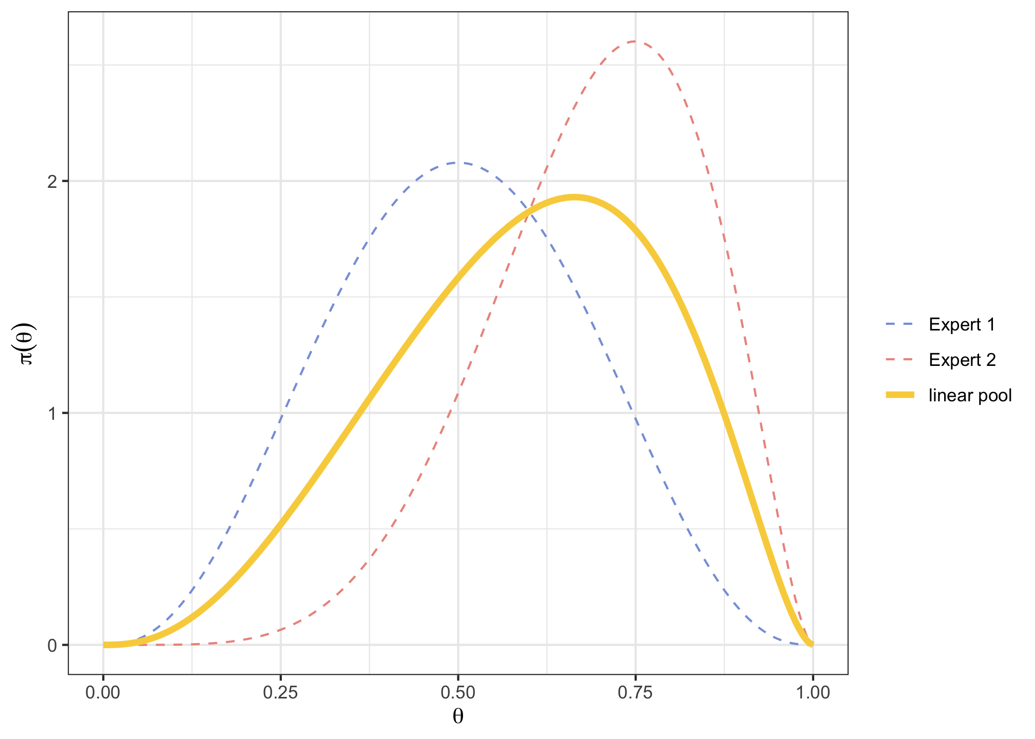 fitdist()function from theSHELFpackage, estimate the parameter form the Beta distribution that best fit each of those elicitations (Protip: have a look at the package intro vignette here).v <- cbind(c(0.2, 0.4, 0.5, 0.6, 0.8), c(0.5, 0.6, 0.7, 0.8, 0.9) ) p <- c(0.1, 0.25, 0.5, 0.75, 0.9) expertPriors <- fitdist(vals = v, probs = p, lower = 0, upper = 1, expertnames=c("Expert 1", "Expert 2"))expertPriors$Beta## shape1 shape2 ## Expert 1 3.634819 3.634835 ## Expert 2 6.047483 2.692690Plot those two Beta prior distributions, along with the “linear pooling” of their 2 curves using the
