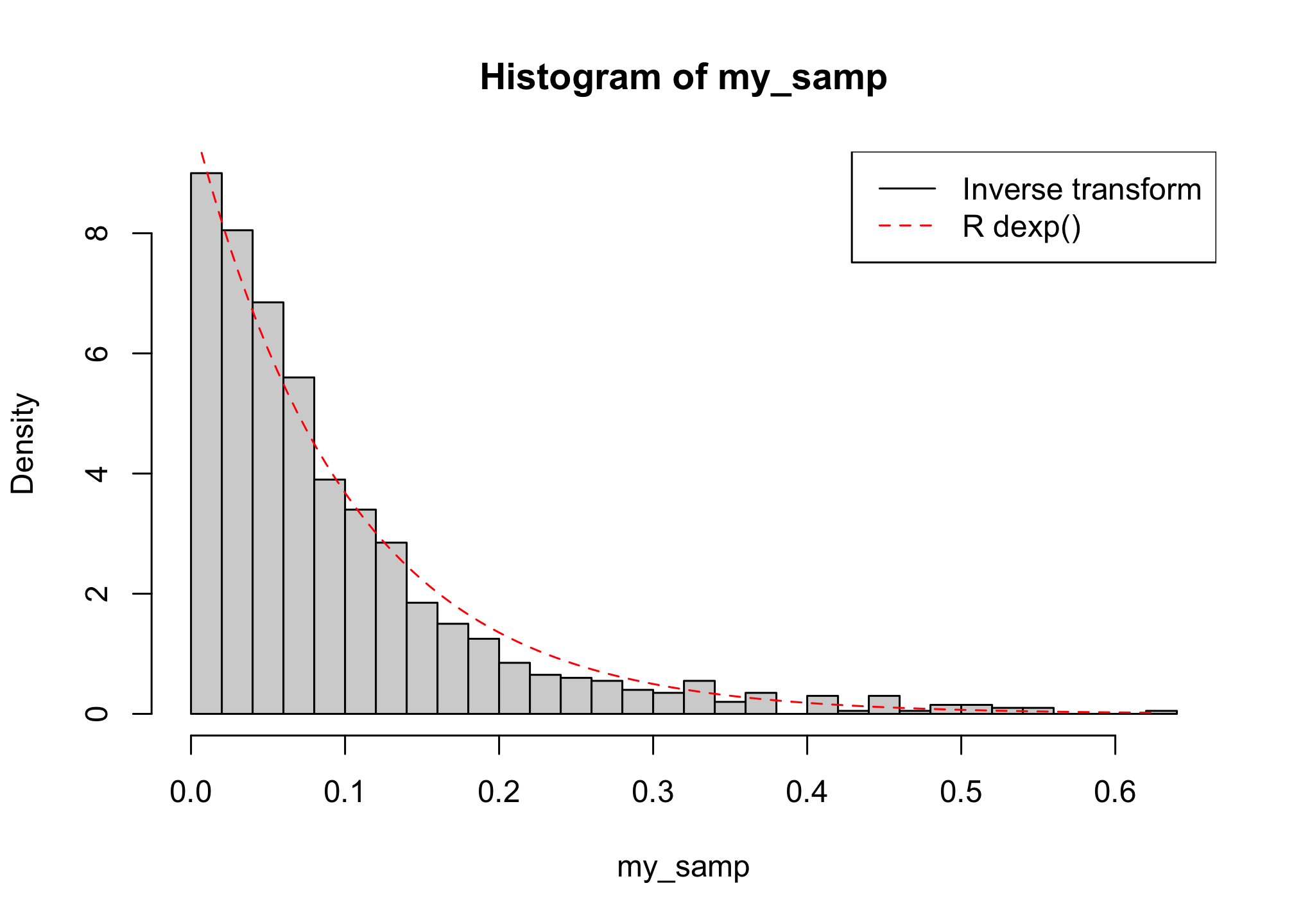 legend("topright", c("Inverse transform", "R dexp()"), lty = c(1, 2), col = c("black",