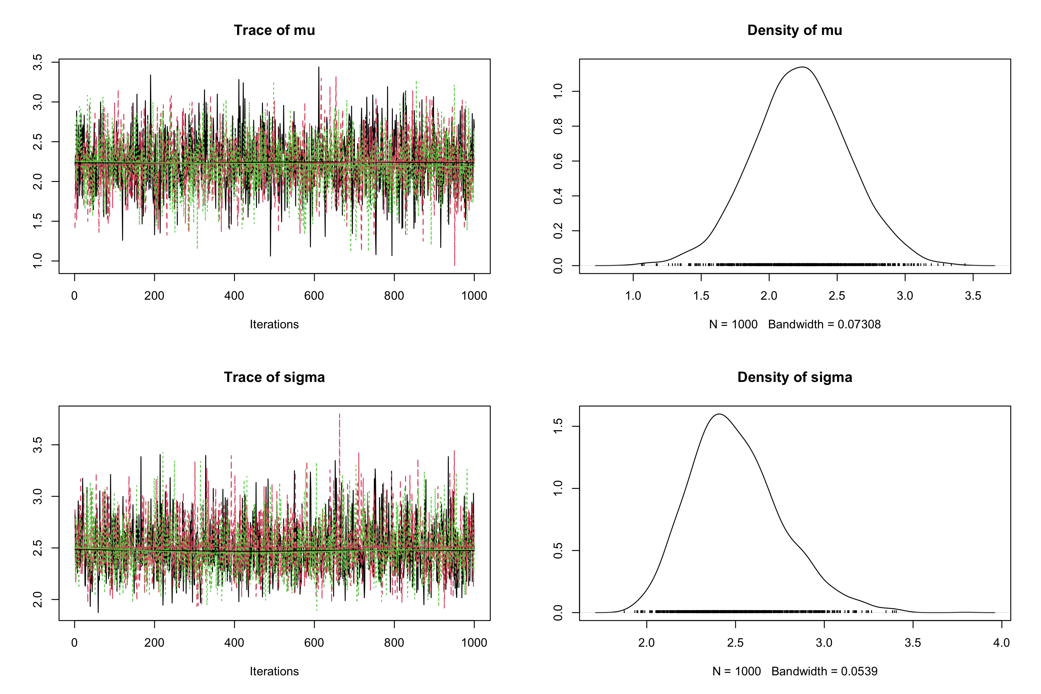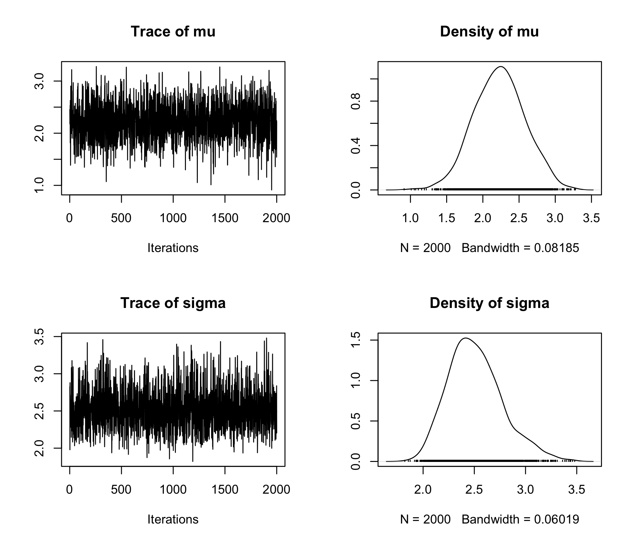 res_sum <- summary(res) res_sum## ## Iterations = 1:2000 ## Thinning interval = 1 ## Number of chains = 1 ## Sample size per chain = 2000 ## ## 1. Empirical mean and standard deviation for each variable, ## plus standard error of the mean: ## ## Mean SD Naive SE Time-series SE ## mu 2.228 0.3542 0.007921 0.007921 ## sigma 2.512 0.2669 0.005968 0.006224 ## ## 2. Quantiles for each variable: ## ## 2.5% 25% 50% 75% 97.5% ## mu 1.536 1.987 2.232 2.460 2.913 ## sigma 2.069 2.324 2.484 2.672 3.108res_sum$statistics["mu", "Mean"]## [1] 2.228383res_sum$statistics["sigma", "Mean"]## [1] 2.511918res_sum$quantiles["mu", "50%"]## [1] 2.231571res_sum$quantiles["sigma", "50%"]## [1] 2.484006res_sum$quantiles["mu", c(1, 5)]## 2.5% 97.5% ## 1.535557 2.913115res_sum$quantiles["sigma", c(1, 5)]## 2.5% 97.5% ## 2.068717 3.107573Load the