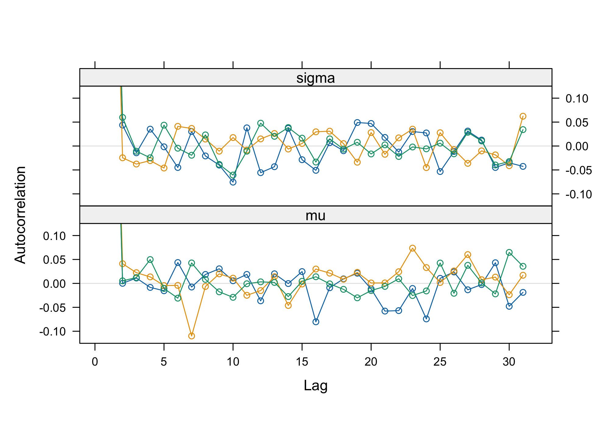 Rfunctionsautocorr.plot()andacfplot()evaluate the autocorrelation of the studied parameters.acfplot(res2)