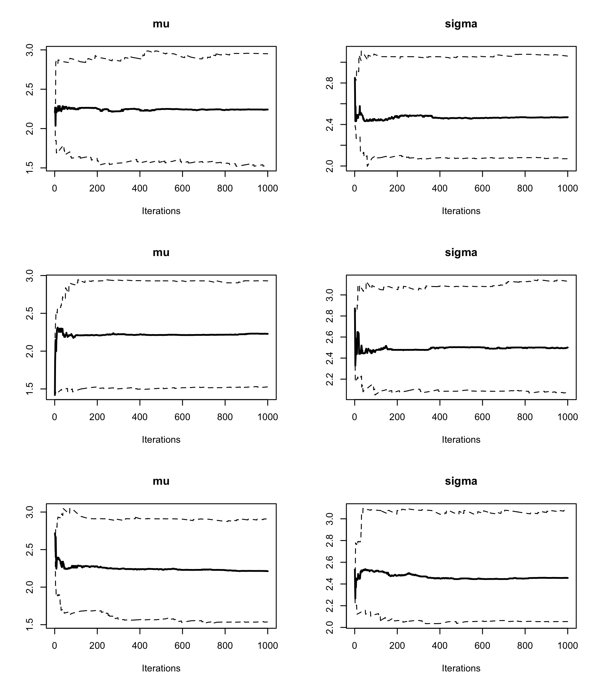 Rfunctioncumuplot()evaluate the running quantiles of the studied parameters. How can you interpret them ?par(mfrow = c(3, 2)) cumuplot(res2, ask = FALSE, auto.layout = FALSE)