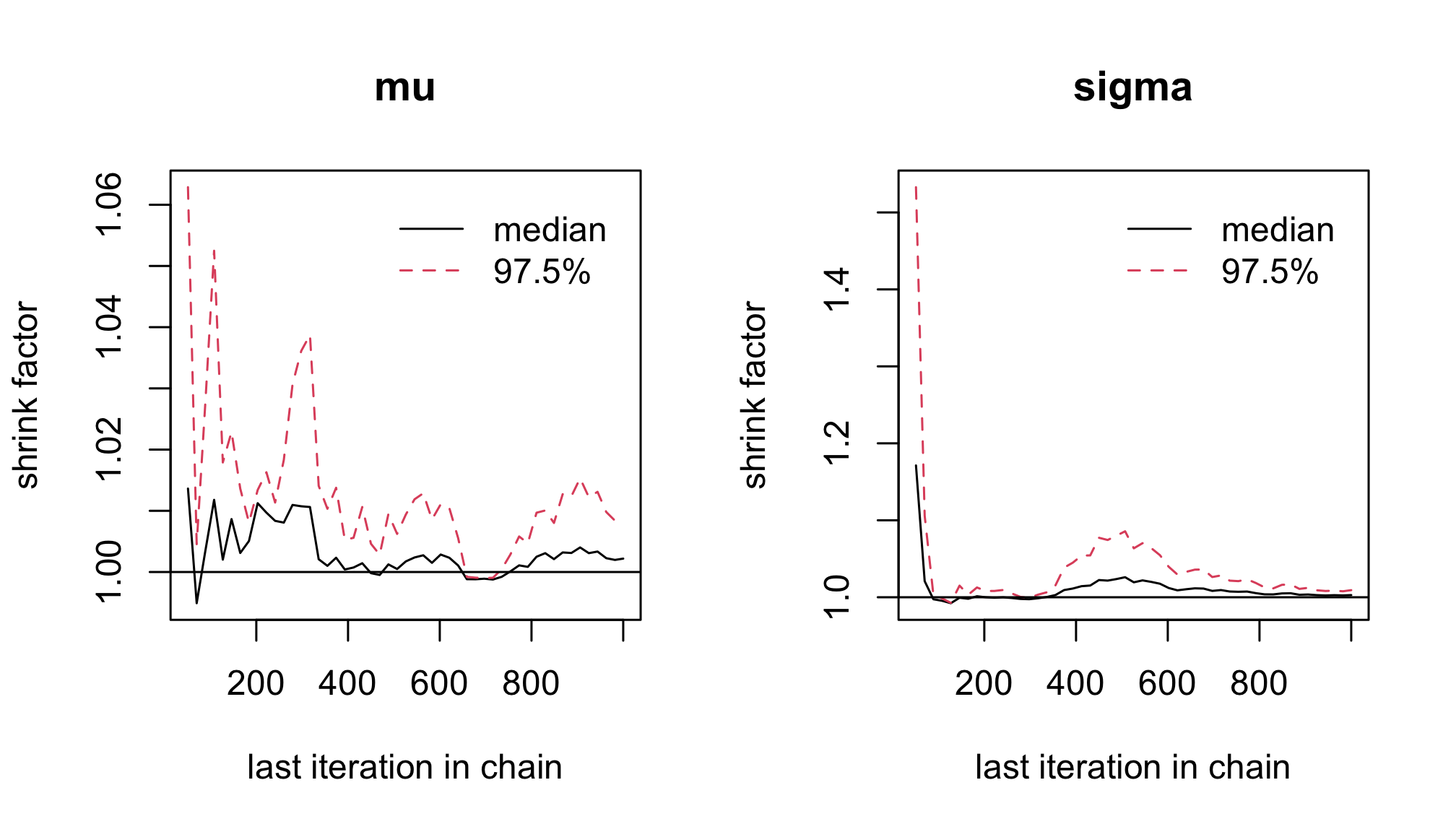 Rfunctiongelman.plot(), plot the Gelman-Rubin statistic.gelman.plot(res2)